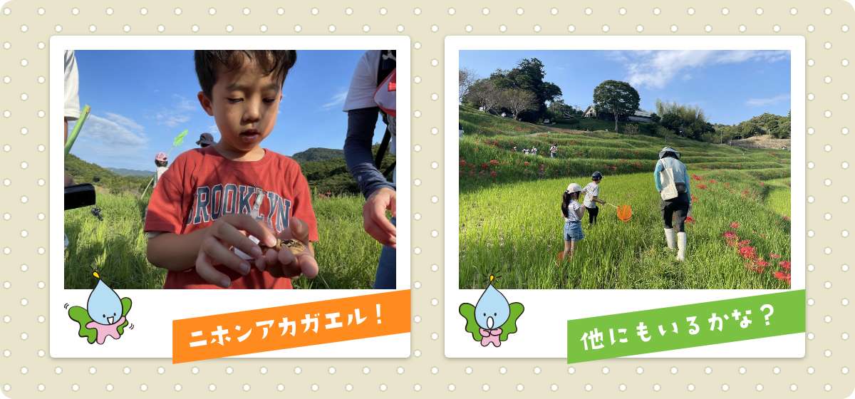 その中でニホンアカガエルを発見。アマガエルとは異なり、足に吸盤がないため木や壁を登るのが苦手で、地上や水辺を中心に生活していることを知りました。さらに、用水路として使われるU字溝を登ることができないため、こうした棚田のような自然環境だからこそ出会えた生き物だと感じました。